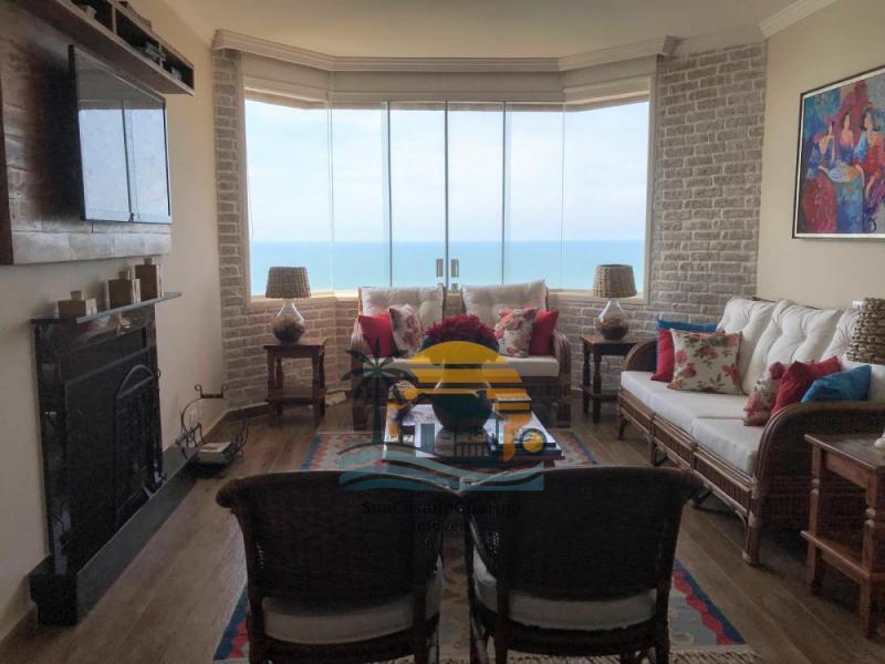 Sala ampla para até três ambientes, sala com lareira, varanda gourmet com fechamento em vidro articulado com vista para o mar